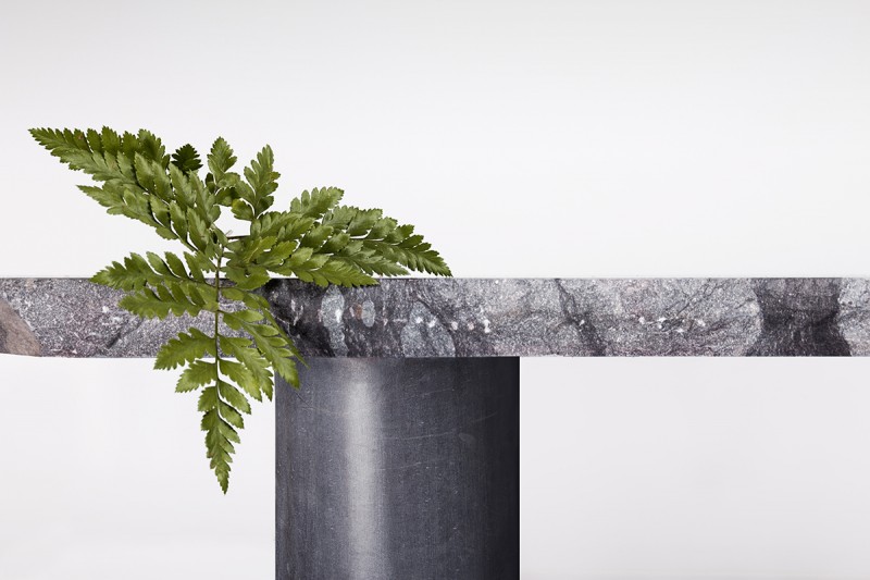Blausee table/bench is a unique piece inspired from the rituals of my grandfather’s walks through forests searching for stones that he would slowly and patiently collect for the sole purpose of building his cabin. As a child I often accompanied him on his walks through forests and abandoned stone quarries. Today those moments are an invaluable memory and represent my idea of luxury. Blausee is a low table/bench made from a special limestone found in the Swiss Alps. This limestone is particular due to its range in color going from red to blue. Some semi finished elements, found on the stone quarry site, were the initial source of this project which represents a dialogue between natural shapes and designed ones. In the manner of a readymade, the platter is simply placed on four circular legs. This piece of furniture can be used as a low table or bench for the interior